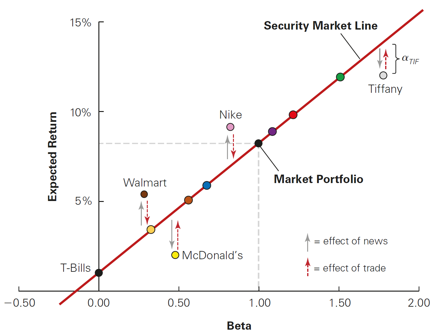 \(\rightarrow\) \(\alpha\) is the difference between a stock’s expected return and its required return according to the Security Market Line