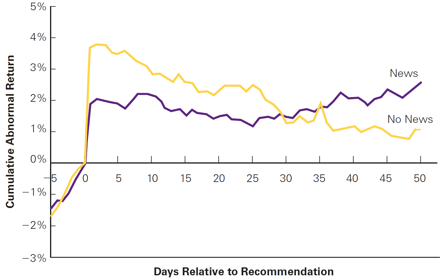 In the case where there is news about the stock that is being recommended, it appears that the stock price correctly reflects this information the next day, and stays flat (relative to the market) subsequently
