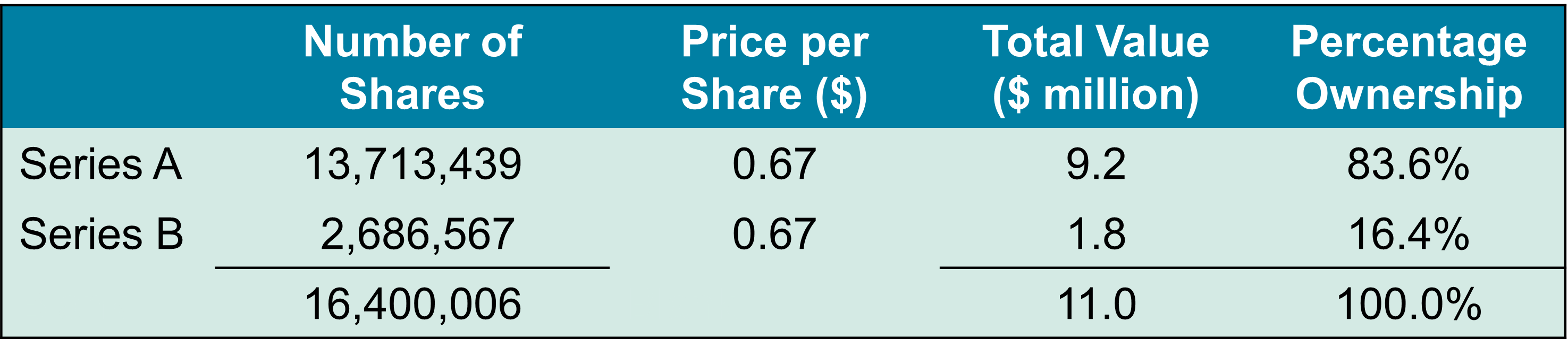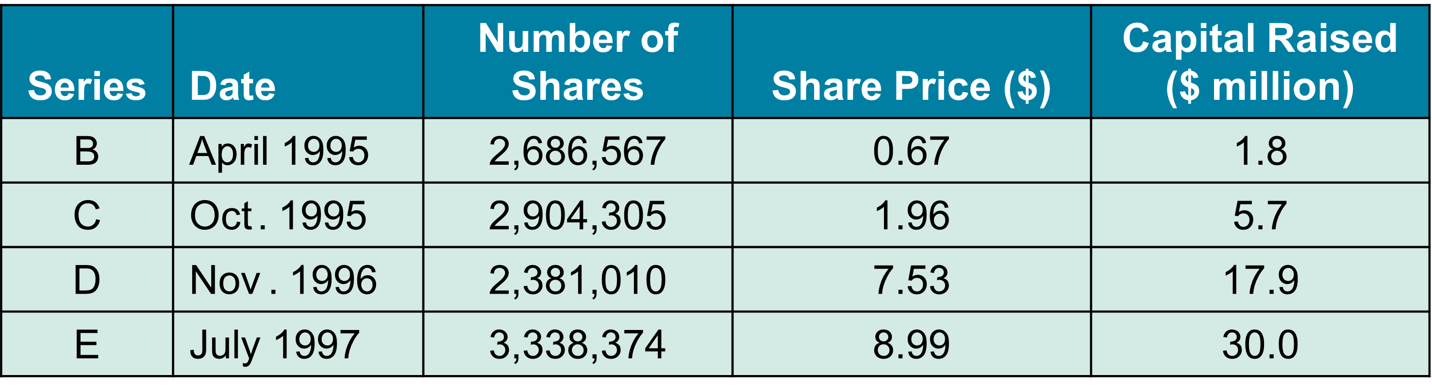 In April 1995, Glaser’s 1 million initial investment represented 13,713,439 shares of Series A preferred stock, implying an initial price of \(\approx\) $0.07 per share