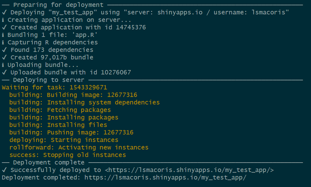 After following the instructions, you should see your app going live on the internet straight from RStudio’s command line: