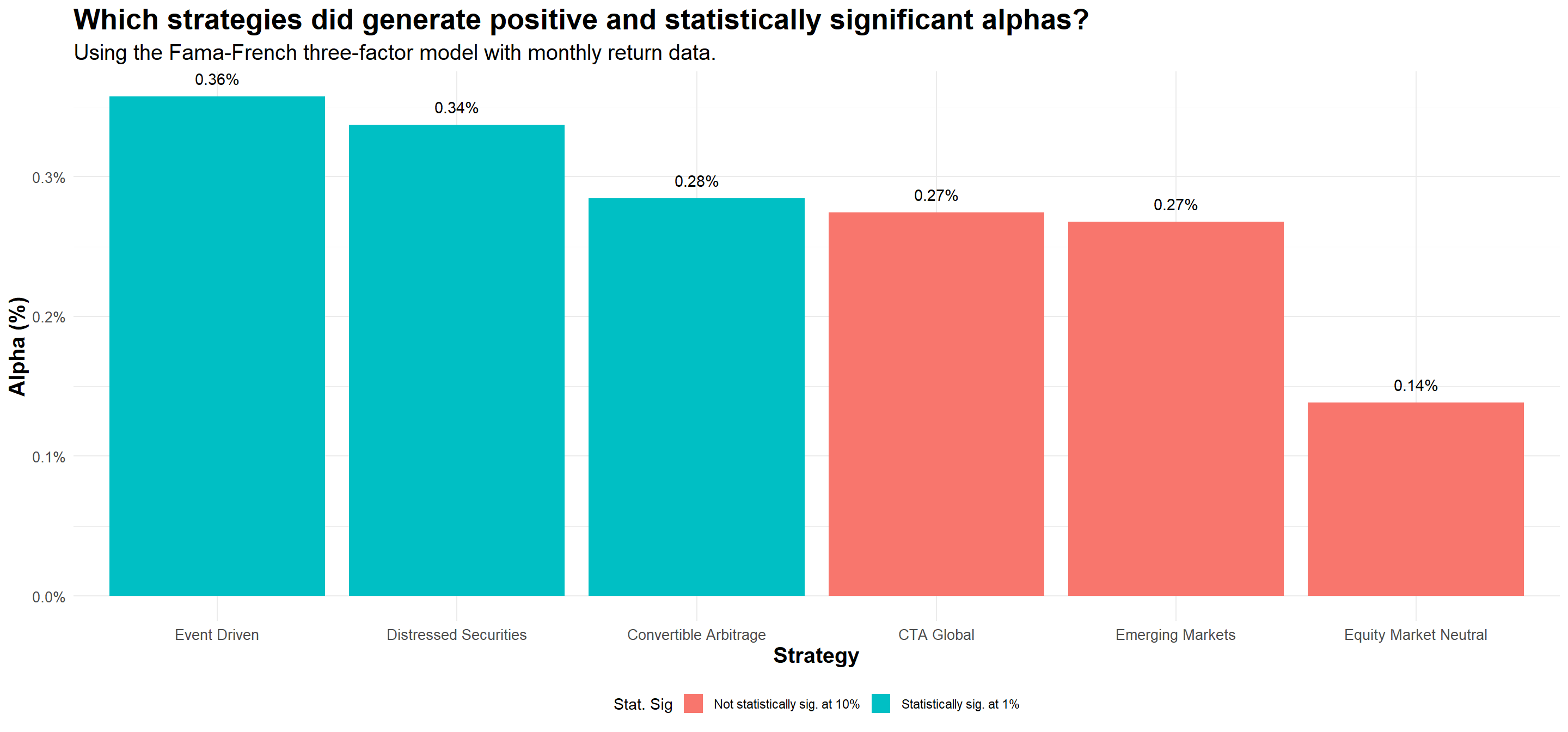 You work as a quantitative analyst at Axe Capital. You have been given the task of analyzing a couple of Hedge Fund strategies and assess whether they have generated true excess returns that could have been attributed to their manager’s skill: