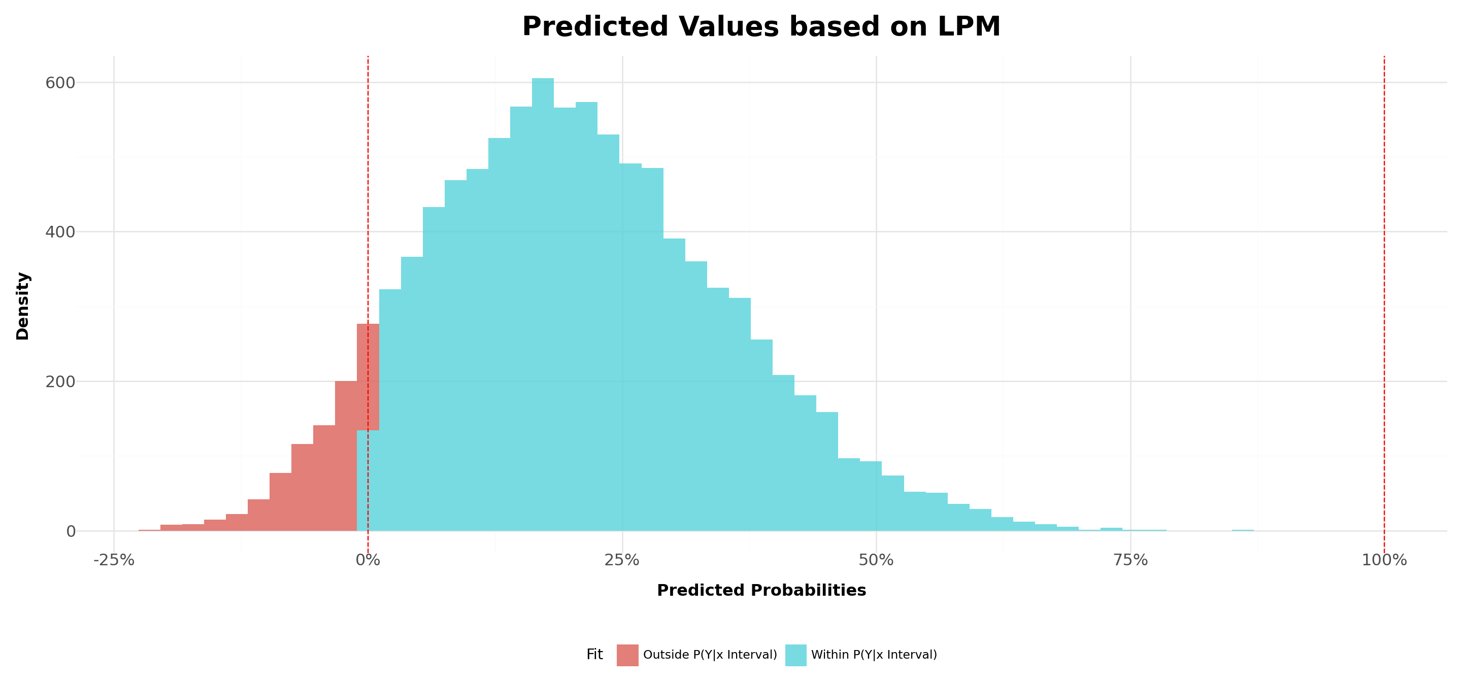 If you tabulate the distribution of Age in your dataset, you’ll see that although LPM does a poor job in predicting probabilities for cases \(<20\), the sample proportion of these cases is less than \(1\%\)