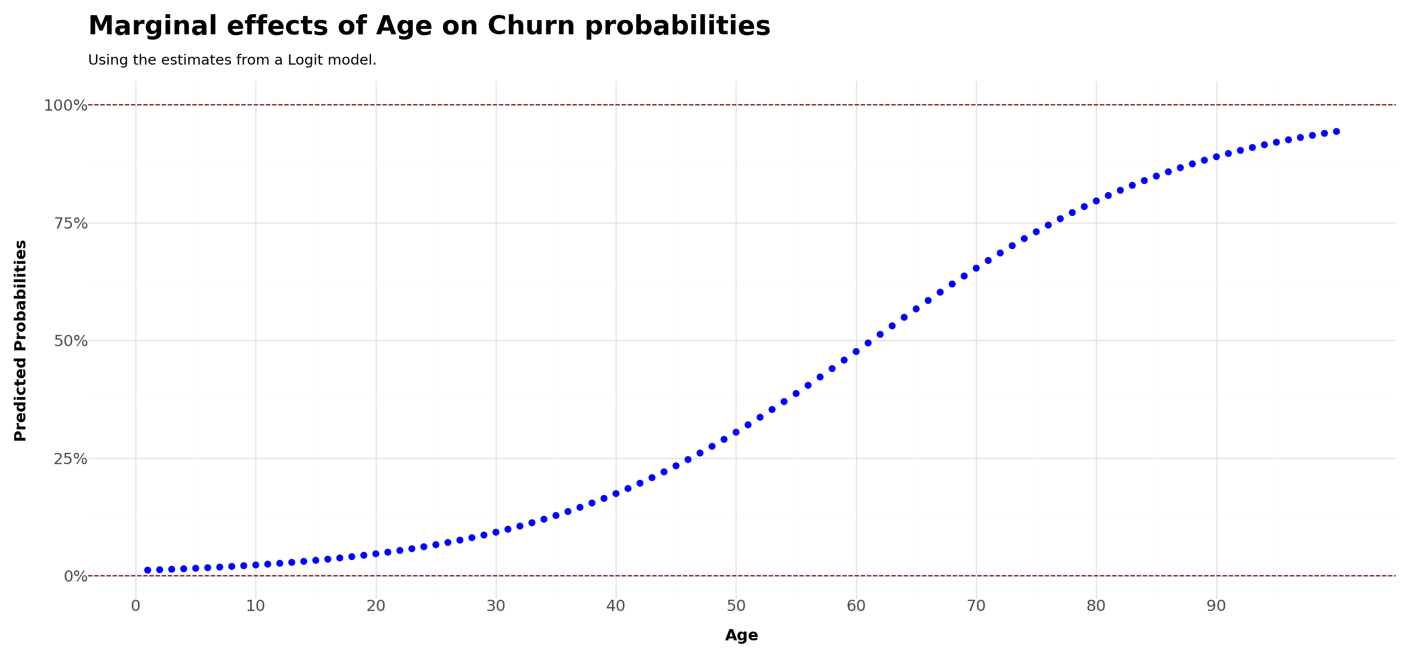title ='Marginal effects of Age on Churn probabilities',
