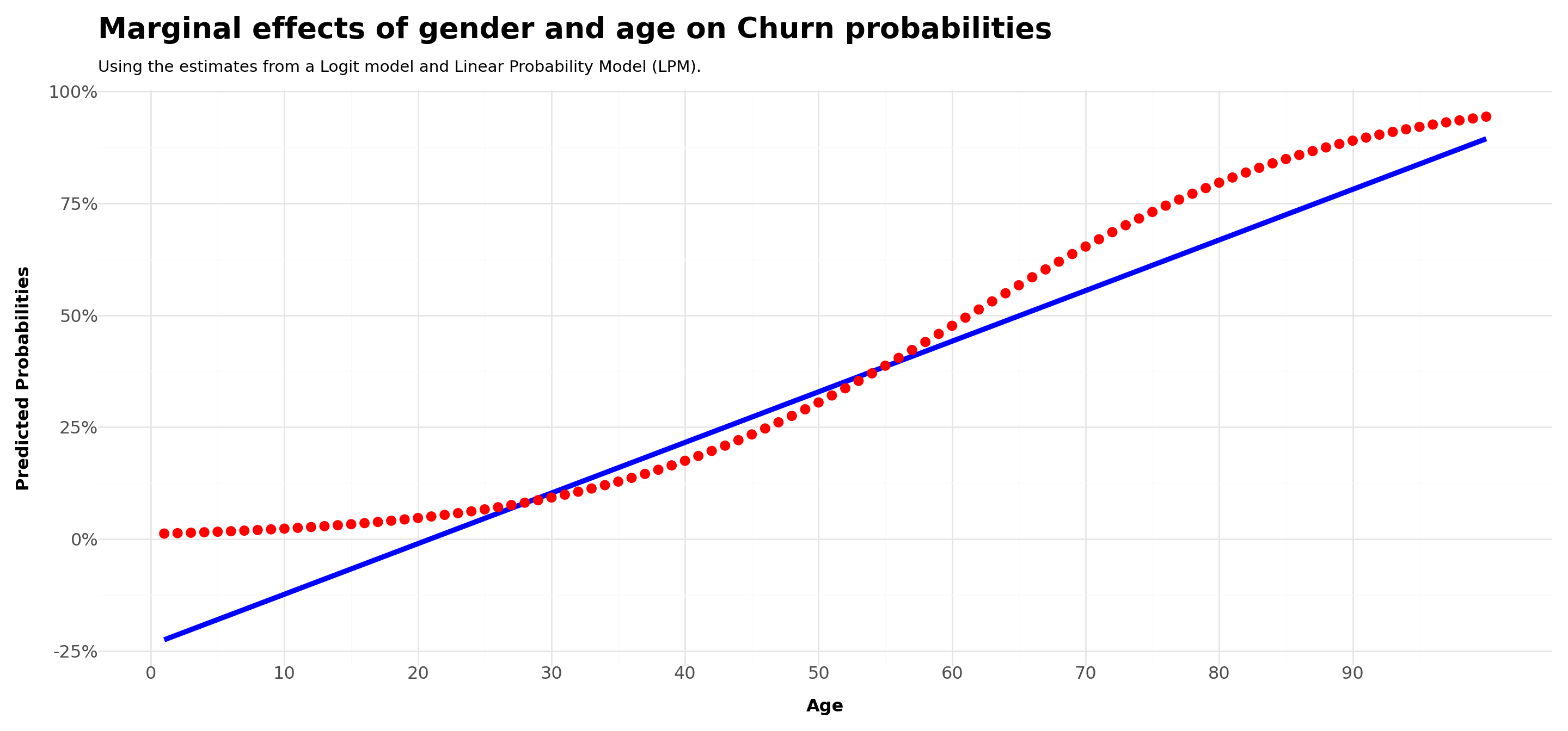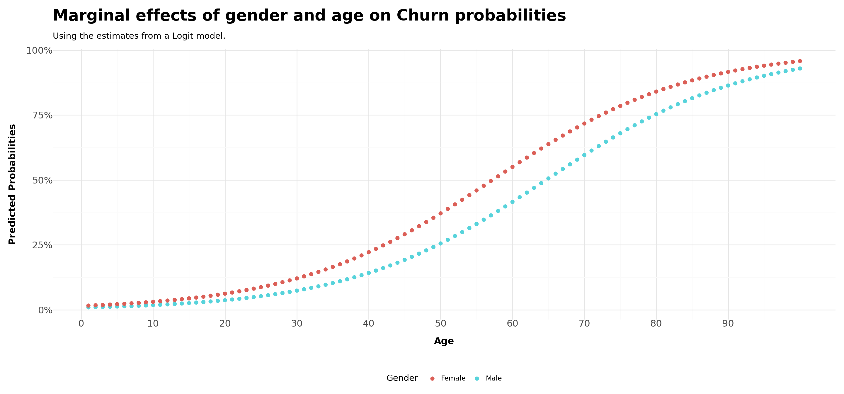 title ='Marginal effects of gender and age on Churn probabilities',