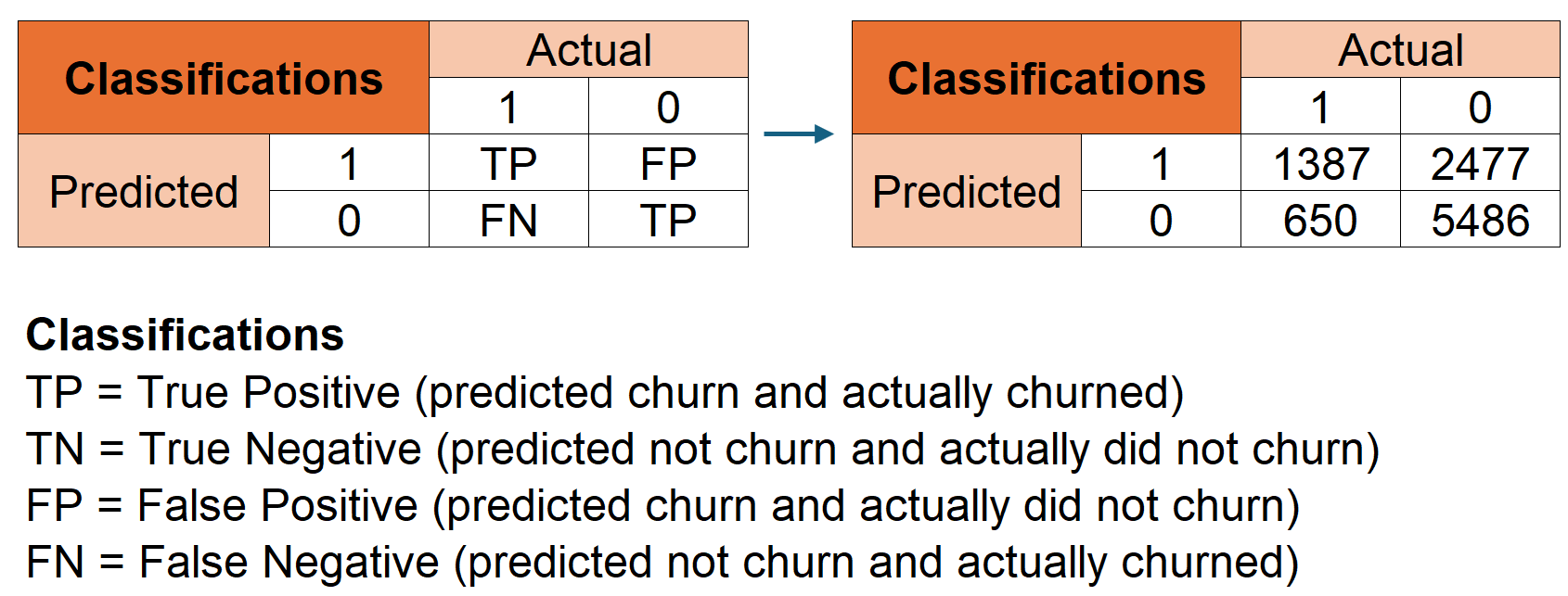 The first question that will likely pop up during internal conversations is: how much of the churned customers we were able to correctly identify?
