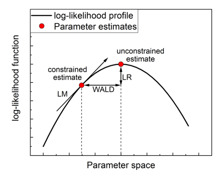 The [Lagrange Multiplier] test evaluates if including an additional parameter significantly improves the model. Based on the score function, \(S(\beta)\), which is the first derivative of the log-likelihood, the test-statistic is defined as: