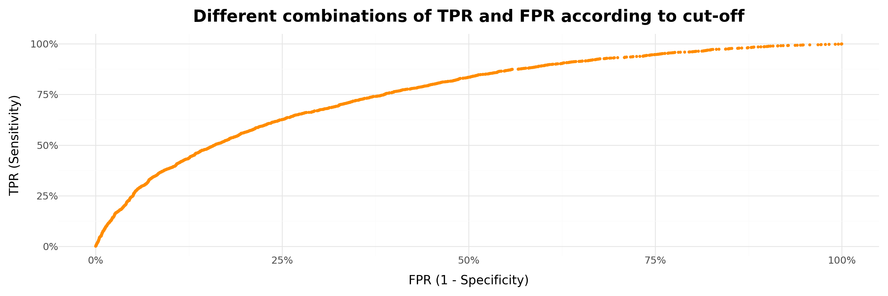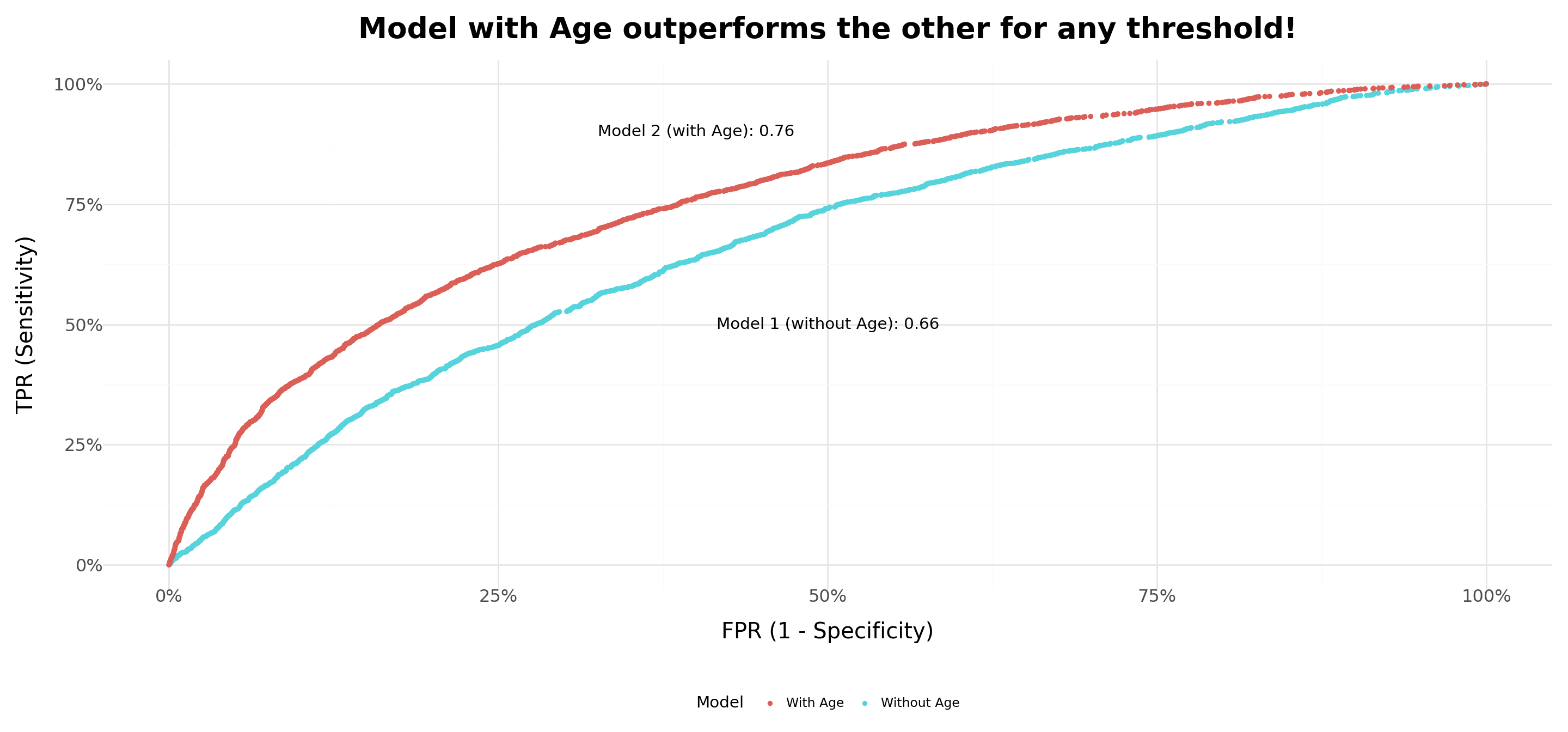 # Define independent and dependent variables for Reg_1 (without 'age')X1 = X.drop('age',axis=1)# Define independent and dependent variables for Reg_2 (with 'age')X2 = X# Dependent variabley = data['churn']# Fit logistic regression modelsreg_1 = model = sm.Logit(y, X1.astype(float)).fit()reg_2 = model = sm.Logit(y, X2.astype(float)).fit()# Predict probabilities for both modelsprobs_1 = reg_1.predict()probs_2 = reg_2.predict()# Compute ROC curvesfpr_1, tpr_1, _ = roc_curve(y, probs_1)fpr_2, tpr_2, _ = roc_curve(y, probs_2)# Compute AUC scoresauc_1 = roc_auc_score(y, probs_1)auc_2 = roc_auc_score(y, probs_2)# Plot ROC curvesData=pd.concat([pd.DataFrame({'Model':'Without Age','FPR':fpr_1,'TPR':tpr_1}), pd.DataFrame({'Model':'With Age','FPR':fpr_2,'TPR':tpr_2})],axis=0)Plot = ( ggplot(Data,aes(x='FPR',y='TPR',fill='Model'))+ geom_point(stroke=0)+ theme_minimal()+ annotate(geom='text',x=0.5,y=0.5,label=('Model 1 (without Age): '+ auc_1.round(2).astype('str')))+ annotate(geom='text',x=0.4,y=0.9,label=('Model 2 (with Age): '+ auc_2.round(2).astype('str')))+ labs(x='FPR (1 - Specificity)', y='TPR (Sensitivity)', title='Model with Age outperforms the other for any threshold!')+ theme(plot_title = element_text(size=12,face='bold'), axis_text = element_text(size=10), axis_title = element_text(size=12), legend_position ='bottom', figure_size=(15,6)))Plot.show()