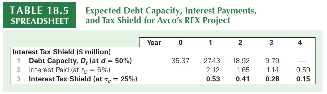Consider again Avco’s acquisition from previous examples. The acquisition will contribute \(\small \$4.25\) million in free cash flows the first year, which will grow by \(\small 3\%\) per year thereafter. The acquisition cost of \(\small \$80\) million will be financed with \(\small \$50\) million in new debt initially. Compute the value of the acquisition using the APV method, assuming Avco will maintain a constant debt-equity ratio for the acquisition.
