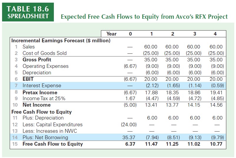 The project’s free cash flow to equity shows the expected amount of additional cash the firm will have available to pay dividends (or conduct share repurchases) each year